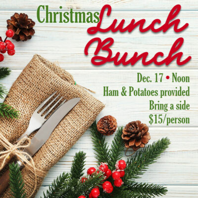 Join us for our Christmas Lunch Bunch on Wednesday December 17 at noon. Ham and Potatoes will be provided; please bring a side! RSVP here
