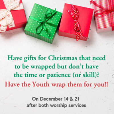 Do you have gifts for Christmas that need to be wrapped but don’t have the time or patience (or skill)? Have the Youth wrap them for you!! On December 14 & 21 after both worship services, the youth...