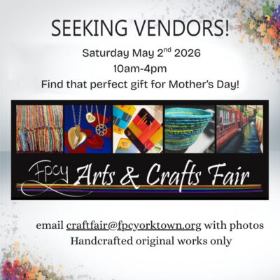 Seeking Vendors FPCY Arts and Crafts Fair Saturday May 2nd 10am-4pm First Presbyterian Church Yorktown 2880 Crompond Rd Yorktown Heights. NY 10598 Vendors must be selling original hand crafted works If...