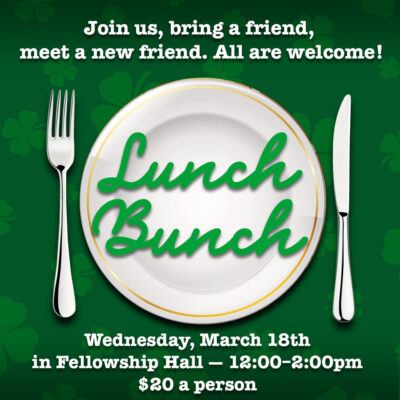 St. Patrick’s Day Lunch Bunch—Wednesday, March 18 at noon Join us for an in-person, catered St. Patrick’s Day Lunch Bunch, Hymn Sing & Love Unbound Coffee Chat. Come enjoy corned beef and cabbage,...