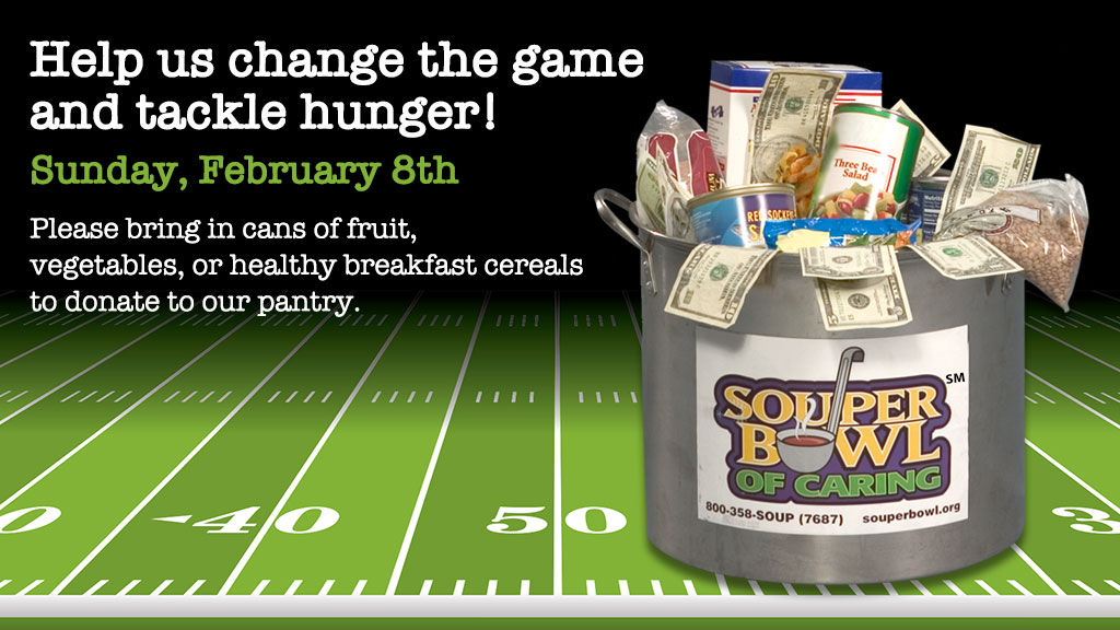 FPCY will be participating by collecting the items most needed for our pantry right now. So on February 8, we ask you to bring cans of fruit, vegetables, or healthy breakfast cereals to donate to our pantry.