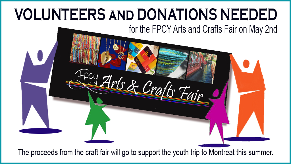 Seeking Volunteers and Donations for the FPCY Arts and Crafts Fair on May 2nd. The Proceeds from the craft fair will go to support the youth trip to Montreat this summer.
